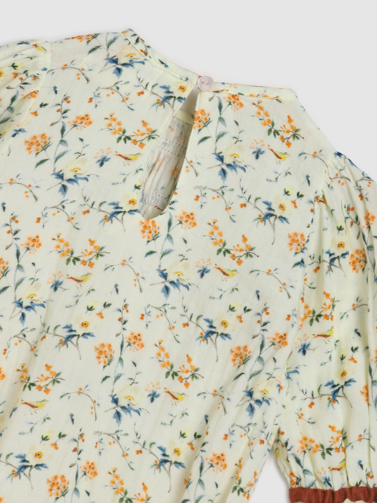 The Pixie Playsuit in Natural Bird combines comfort and charm with its shirred bodice and puff sleeves with a super cute trim sleeve. The elasticated legs allow for easy movement, making it perfect for everyday adventures.