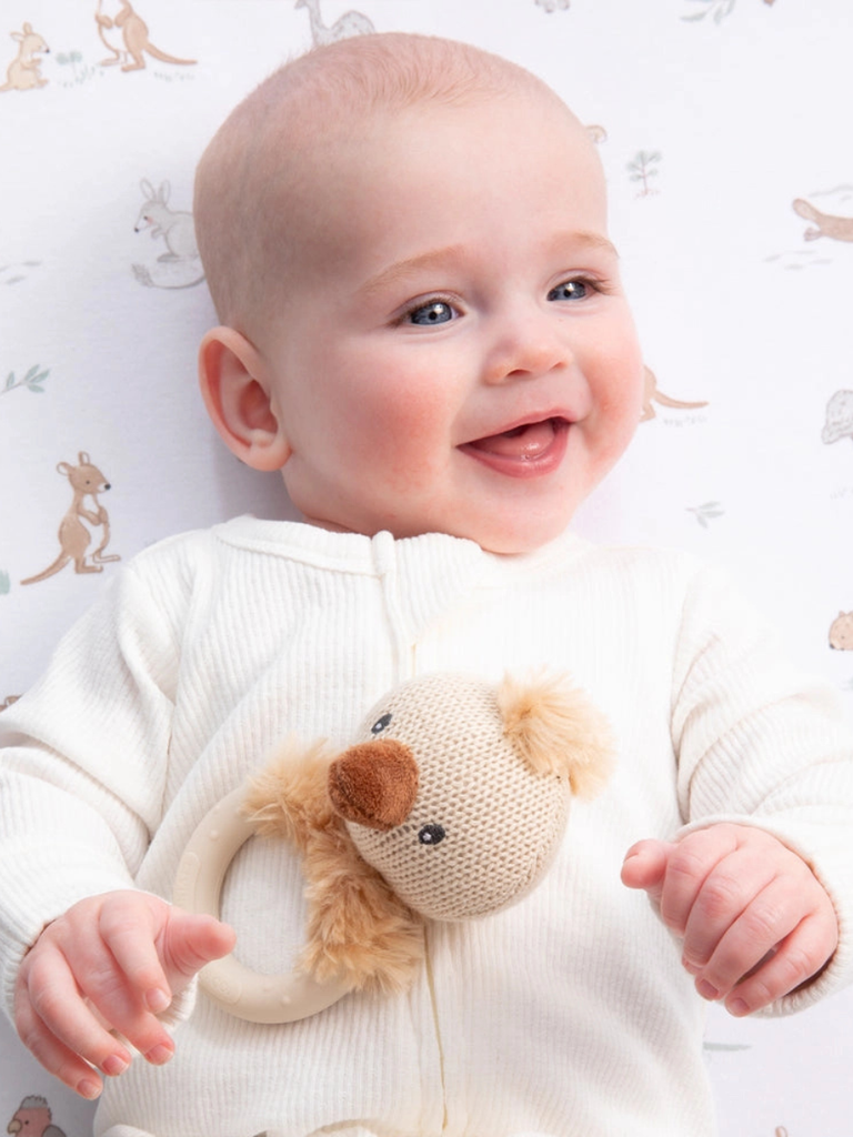 Delight and soothe your little one with our charming Emu Rattle. Crafted from soft cotton knit with a handmade feel, it features a gentle jingle and a BPA-free silicone teether ring - perfect for tiny hands and growing gums.