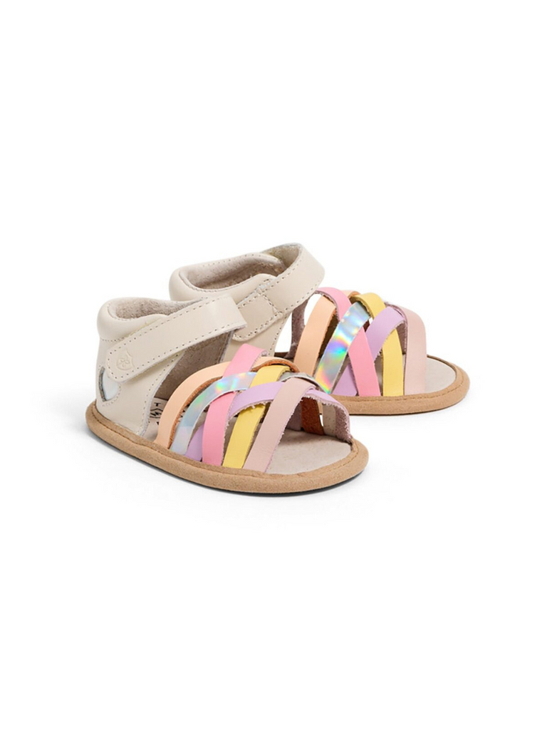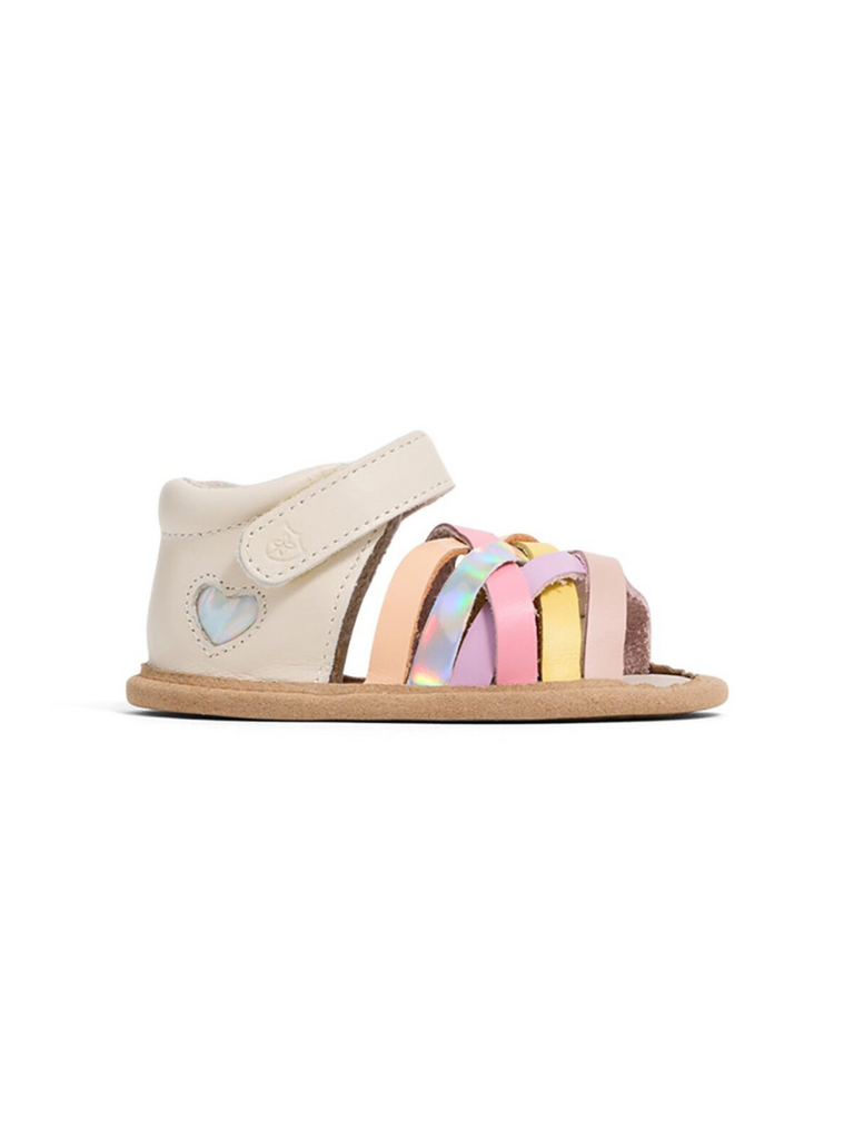Meet Baby Ariel. Featuring a beautifully designed interlaced front with rainbow-coloured straps and a shimmering heart underlay at the sides, Ariel is a must-have for baby girls this summer. A padded heel and fully adjustable strap provide comfort and ease of wear.