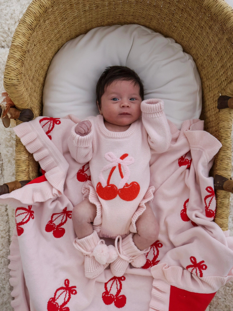 Add a pop of colour and sweetness to your baby girl’s wardrobe with Petite + Co's pink knit romper featuring adorable boucle cherry bow.