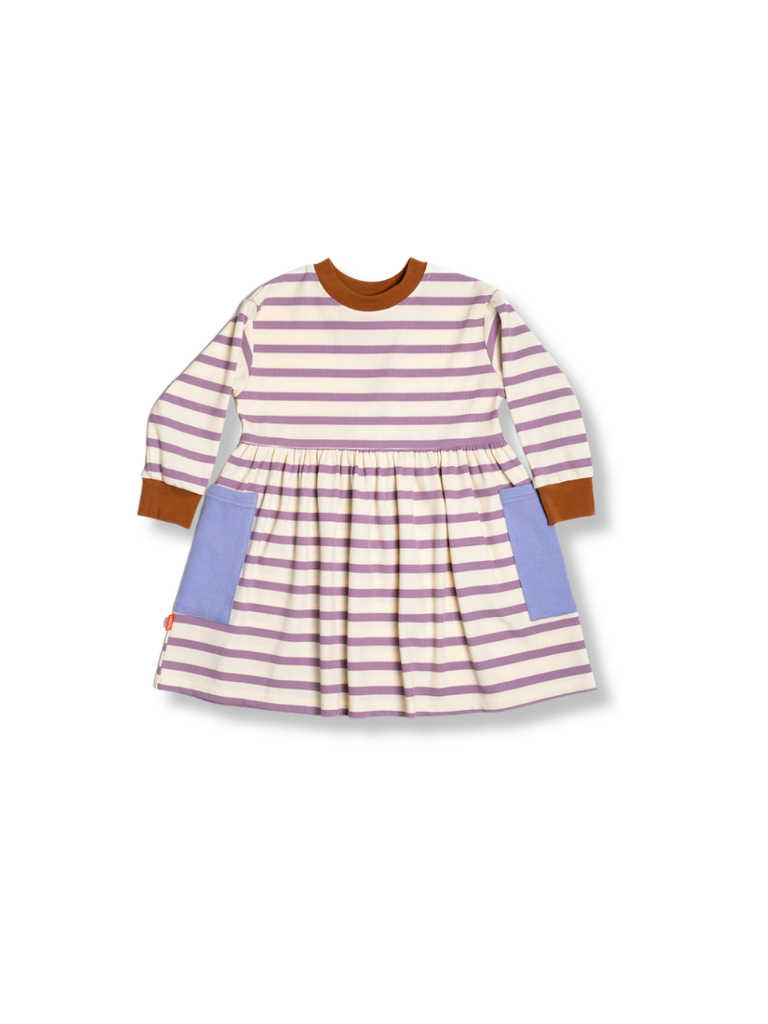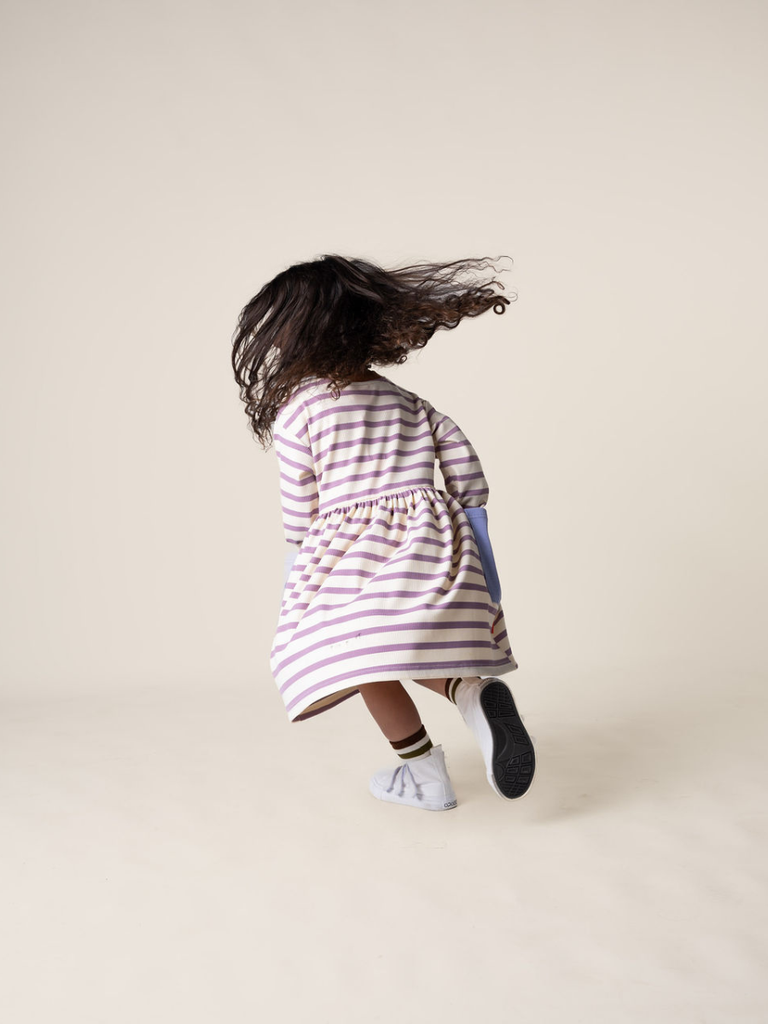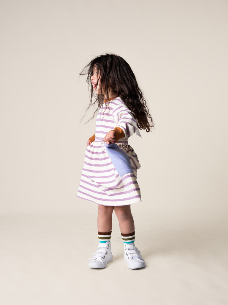 A playful everyday dress designed for comfort and movement. The Purple Striped Bell Dress features soft horizontal stripes in gentle tones, finished with contrast rib trims and oversized front patch pockets for a fun and practical detail.