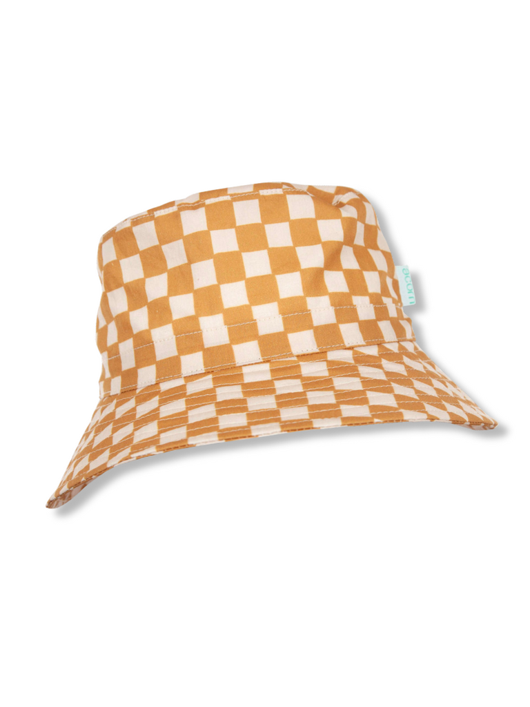 Let the summer fun begin, with this super cool caramel and cream checks print on the outside and inner brim. The original artwork was designed in Melbourne by artist Jacinta Weir.