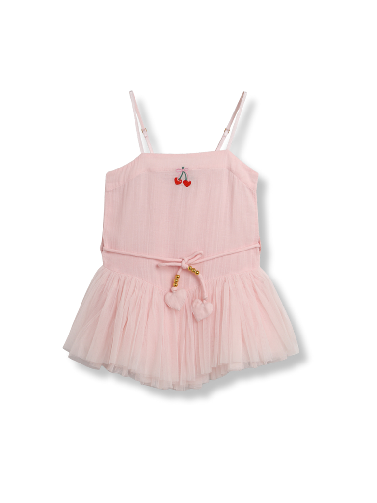 The Freya Tutu in Petal Pink is THE elegant piece for this summer. Perfect for your little one to twirl through special occasions. Crafted from soft cotton gauze with a delicate layered tulle skirt, it blends comfort and charm effortlessly. The playful cherry embellishment and heart- shaped accessories add a touch of fun to its classic design.