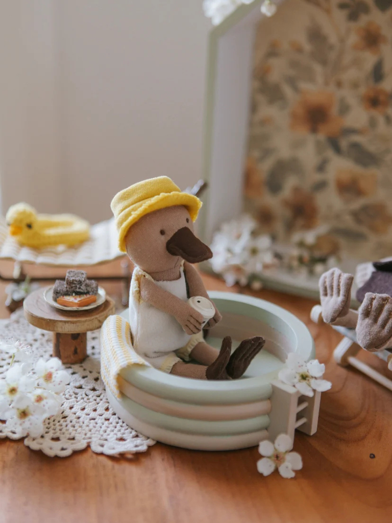Crafted in our signature Rugaroo plush style, Puddles is a miniature heirloom platypus doll designed for our Ocean Road Play Mat, dollhouse-compatible play, small-world nature scenes and gentle storytelling. With her gumleaf-green tones, soft textures and floaty spirit, she brings calm, creativity and Aussie bush magic into every playroom.