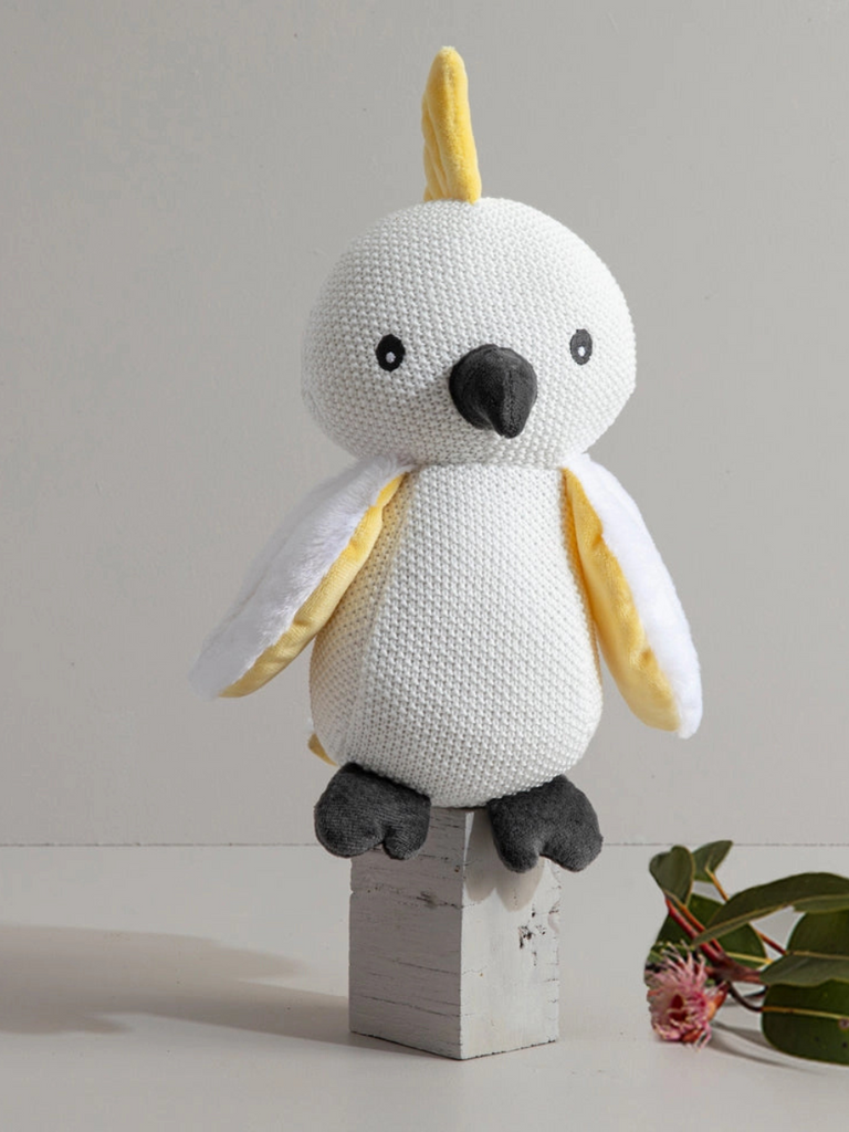 Delight little ones and parents with our charming Colin the Cockatoo Knitted Toy. Beautifully crafted from mostly cotton with a pearl knit finish, they offer a lovely handcrafted feel. Each features a gentle rattle for playtime and comes with a sweet name label - perfect for cuddles, keepsakes, or gifting.
